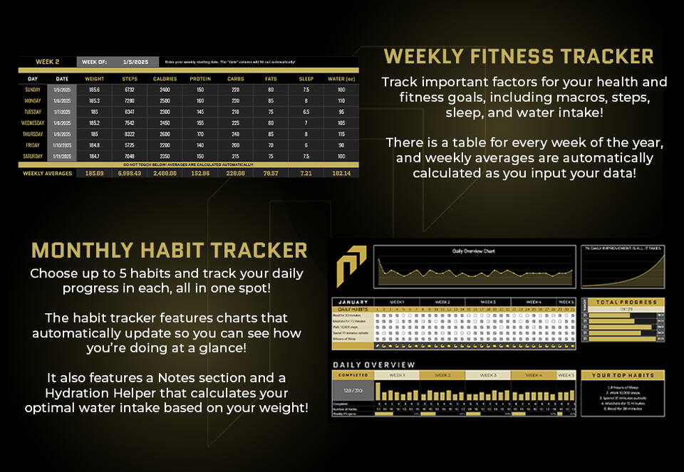 The Progress Protocol 2025 Progress Tracker features a macro tracker for every week of the year. This tool lets you easily measure several important health metrics, from calorie and protein intake to sleep quality and hydration.It also features a Habit Tracker tool for every month of the year. Choose your habits, measure your progress, and leave notes for yourself to make sure you’re making steady progress towards your goals!